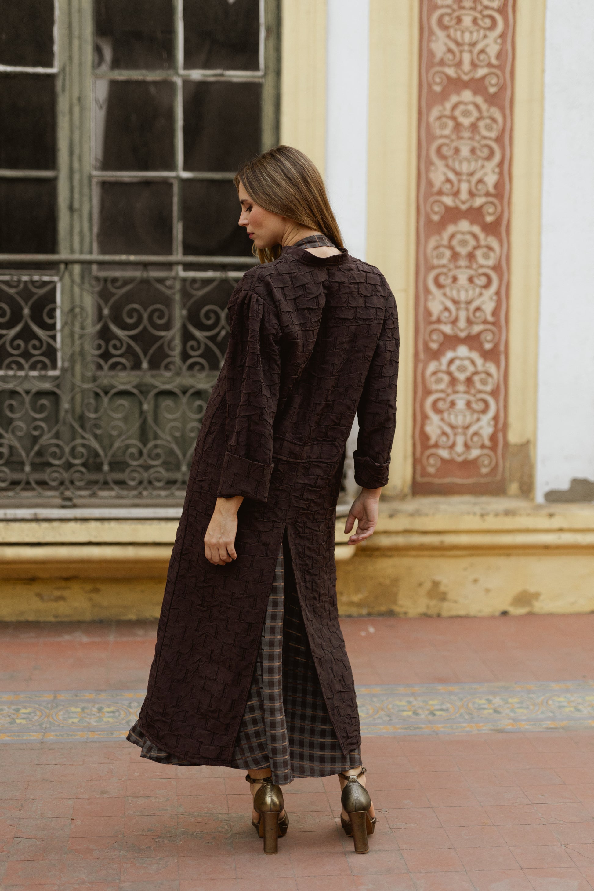 Cuenta con un botón delantero bronce y mangas con un delicado corte acampanado que aportan estilo. En la parte trasera, una costura en la espalda que realza la silueta, trabilla decorativa para un acabado estructurado y sofisticado, mientras que la abertura posterior brinda mayor comodidad y movimiento al caminar.