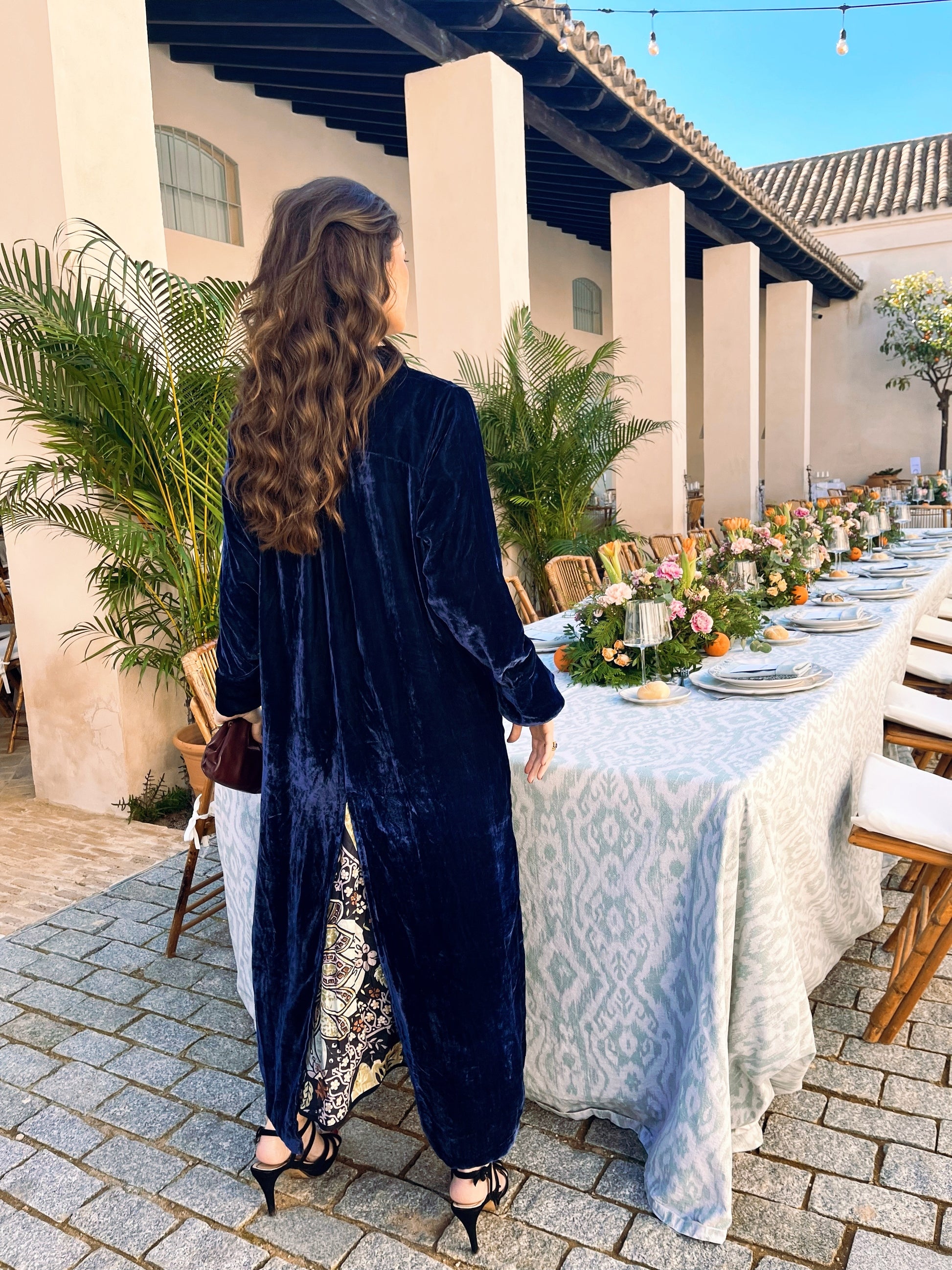 Cuenta con un botón delantero forrado en el mismo terciopelo de seda y mangas con un delicado corte acampanado que aportan estilo. En la parte trasera, una costura curva en la espalda realza la caída natural del tejido, mientras que la abertura posterior brinda mayor comodidad y mo cimiento al caminar.