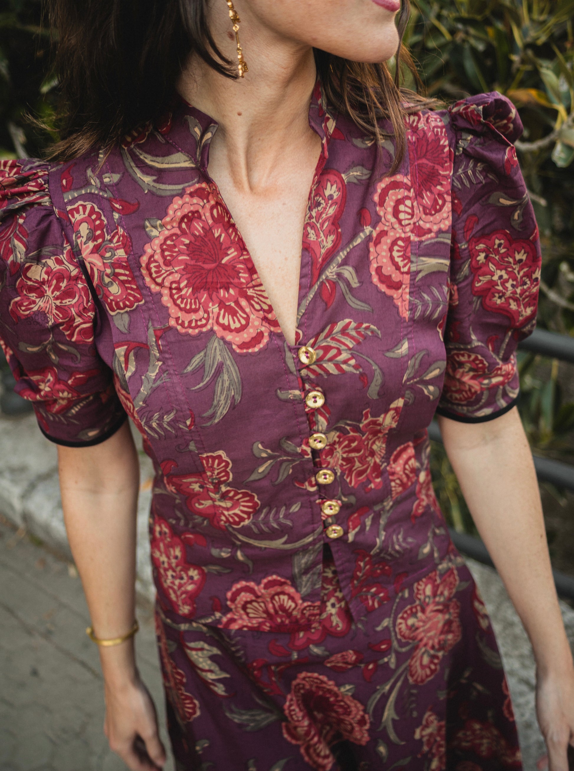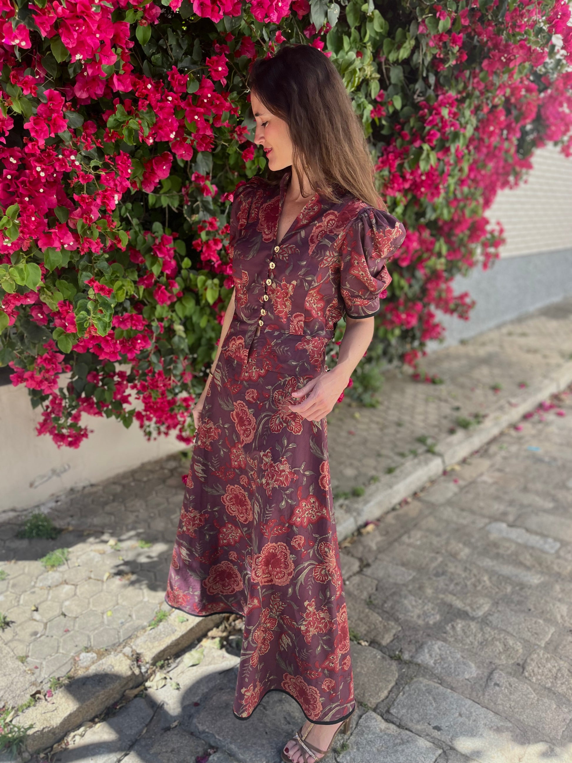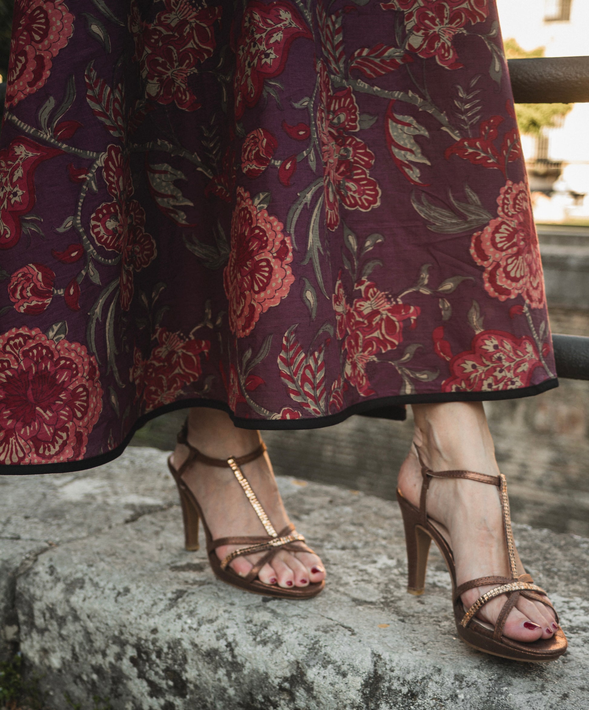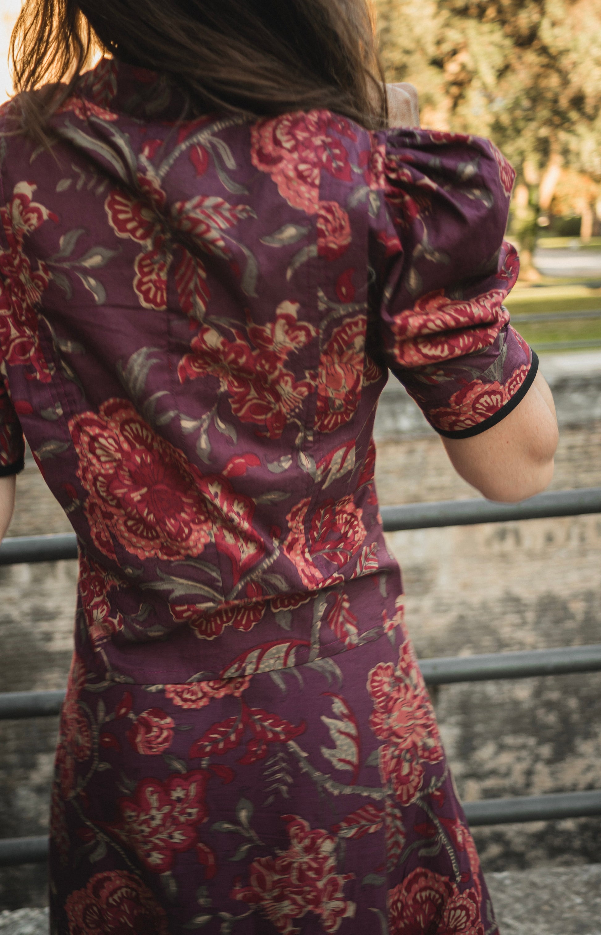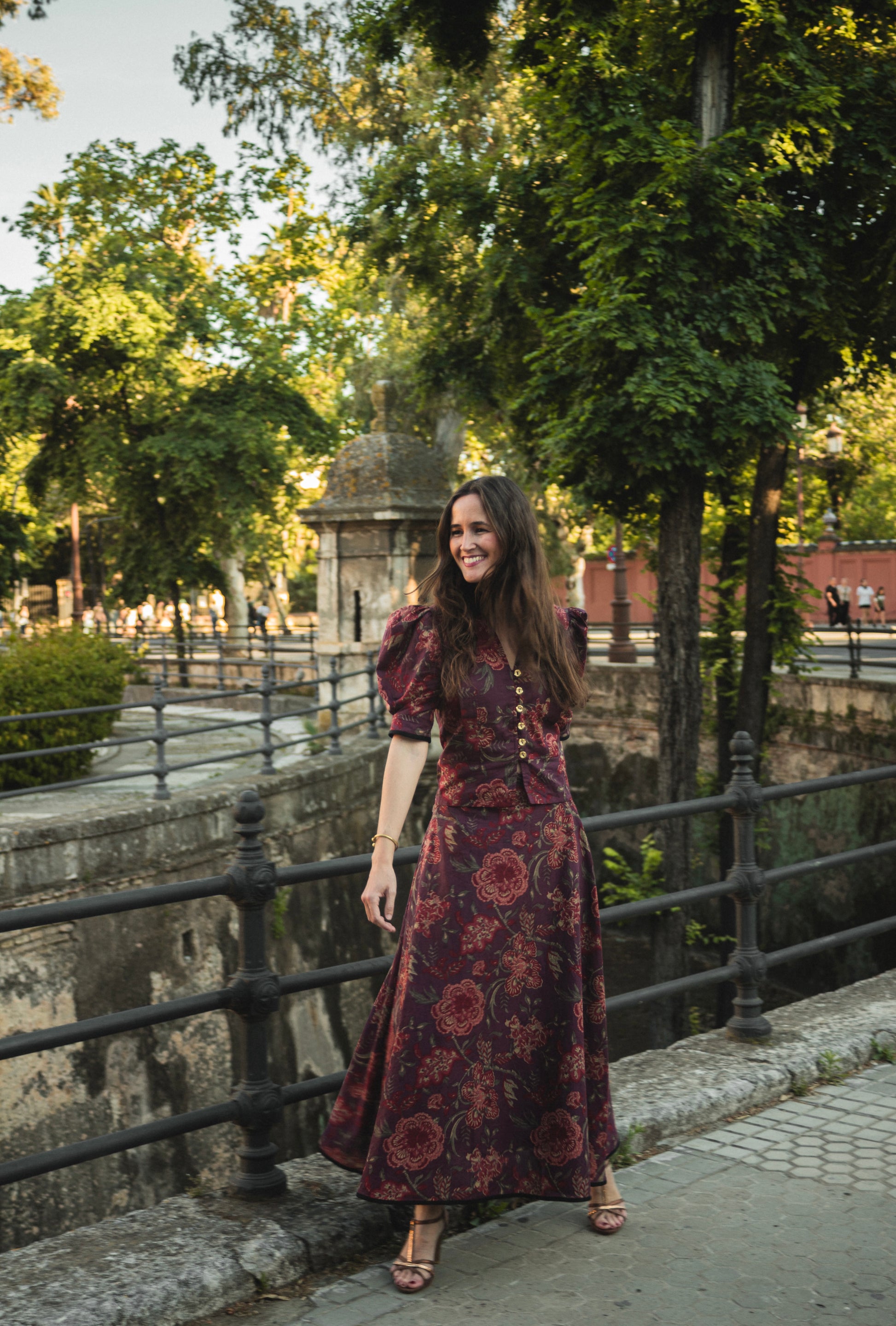 La falda larga con vuelo aporta movimiento y ligereza. Cuenta con cremallera lateral, forro interior y acabado en vivo a juego. Su estampado en tejido 100% algodón convierte el conjunto en una pieza versátil y especial.