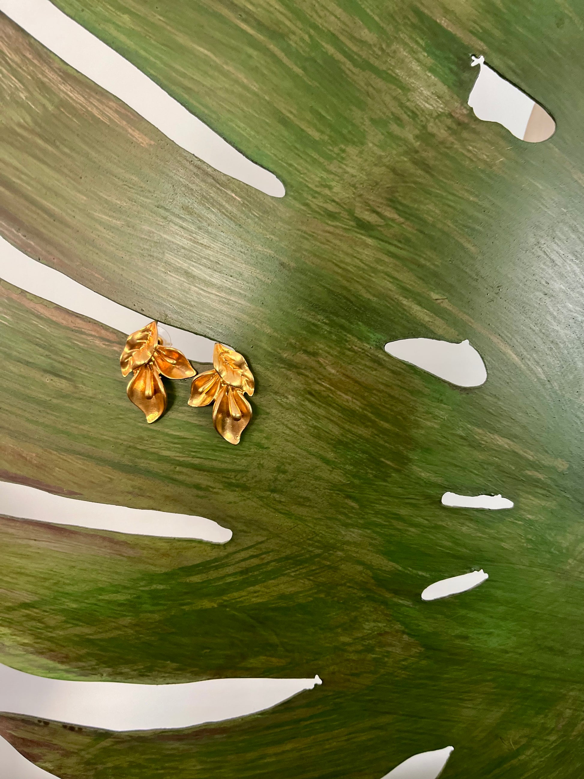 Pendientes hechos en bronce chapado en oro de 22 quilates, combinados con piedras naturales.